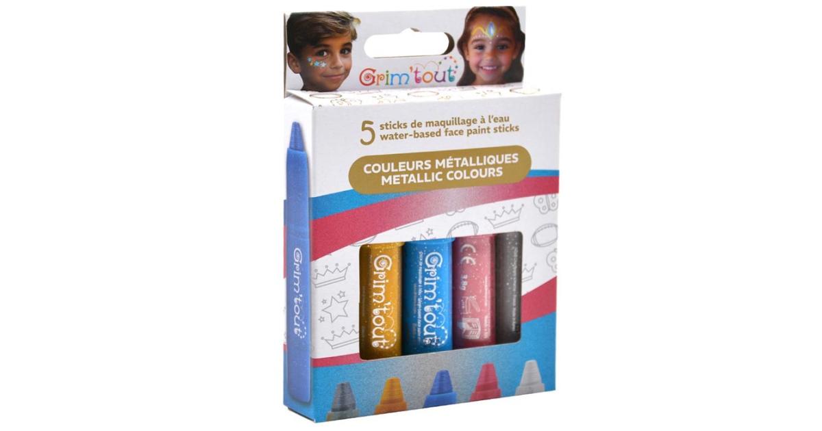 Lápis de maquilhagem para pinturas faciais para festa. Inclui 5 lápis com glitter com tinta à base de água com 1x5,5cm da marca Grim'tout. Disponível em outras cores na nossa Loja Online. Atenção. Evitar a aplicação na área dos olhos, lábios e feridas. Não ingerir! Em caso de contato com os olhos, lave com abundante água. Em caso de alergia, consulte o seu médico. Não contém glúten. Supervisão de um adulto e recomendado quando usado por crianças. Conservar abaixo dos 40°C. Contra-indicado para crianças com menos de 3 anos. Peças pequenas. Ingredientes: Água, glicerina, Estearato de sódio, palmitato de sódio, talco, Butilenoglicol, miristato de sódio, PVP (Polivinilpirrolidona), Propilenoglicol, Ceteareth-25, Lauril éter sulfato de sódio, caprilato de glicerila, Ceteth-25, fenoxietanol, óleo de rícino hidrogenado PEG-60, 1,2- Hexanediol, Dimenticone, Cloreto de cetilpiridínio, caprilil glicol, ácido caprílico, ácido benzoico, (+/- CI 77891, CI 77266, CI 74160, CI 19140, CI 12490).