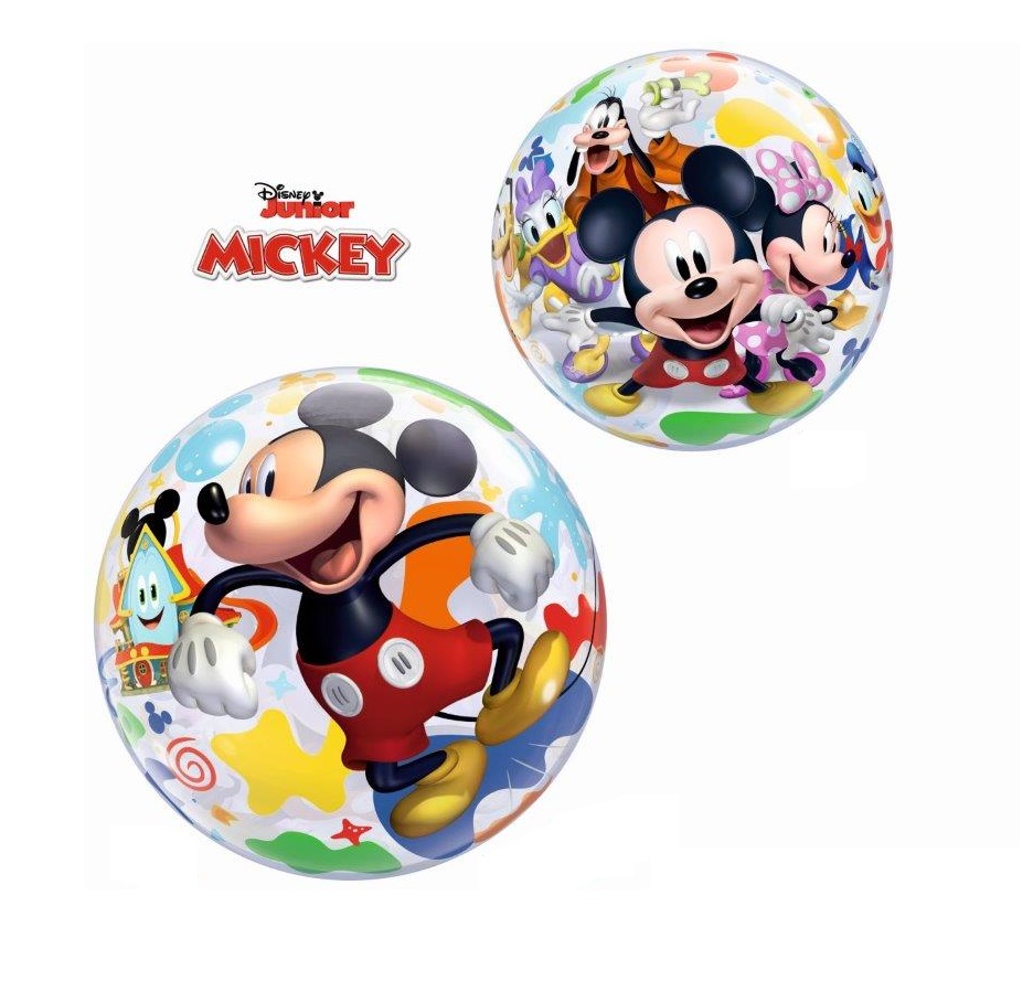 Balão Bubble para festa de aniversário com tema Mickey. Inclui um balão bubble de 22" (56cm de diâmetro) transparente com imagens da Mickey e amigos.