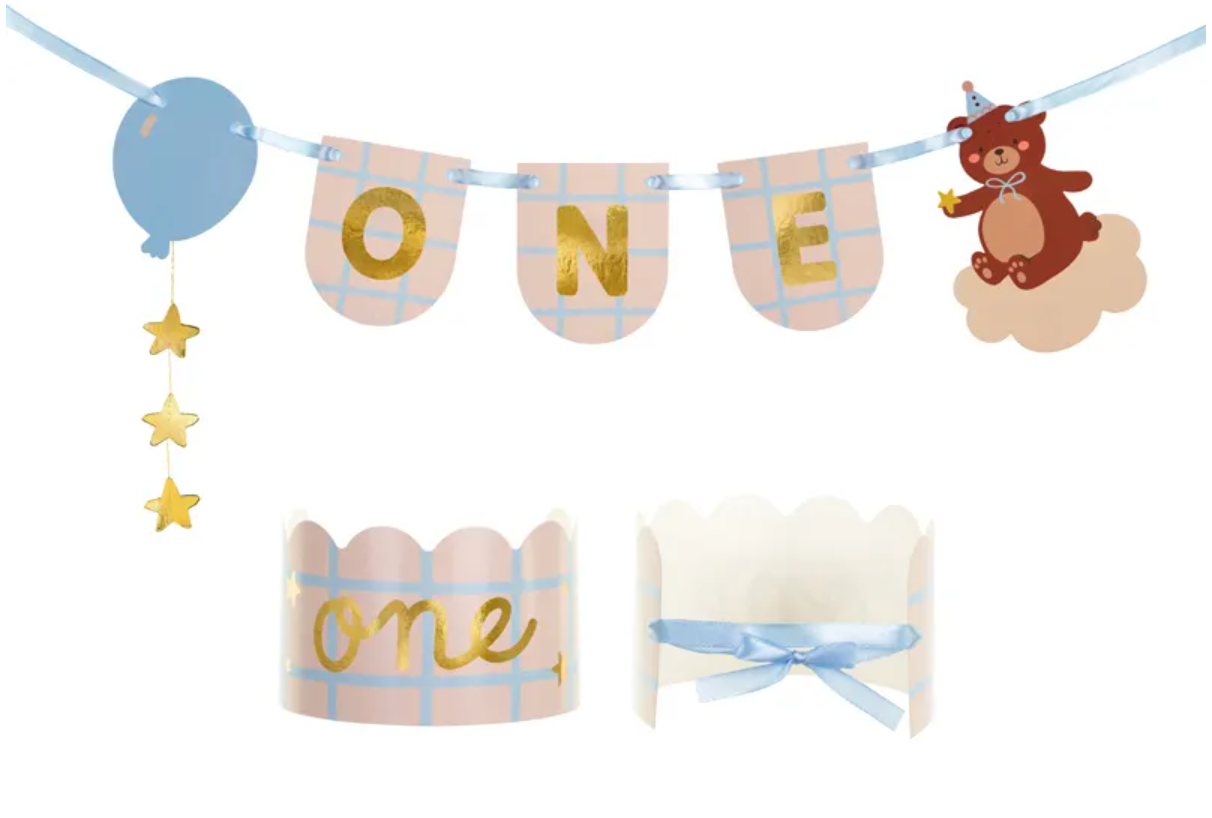 Conjunto de faixa e coroa em forma de ursinho de pelúcia, feito de papel, mistura de cores, dimensões da faixa: aprox. 50 x 20,5 cm, comprimento do barbante aprox. 36 cm, dimensões da coroa: altura aprox. 8,5 cm, diâmetro aprox. 11 cm. Produto para automontagem.