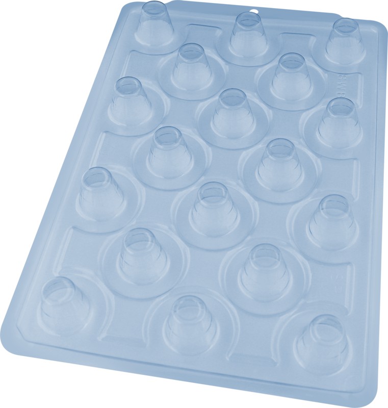 Forma especial com silicone (3 partes), ideal para produção de chocolates com muito mais praticidade e precisão. Possui uma “marquinha” indicando a quantidade necessária de chocolate, levando ao frio uma única vez.