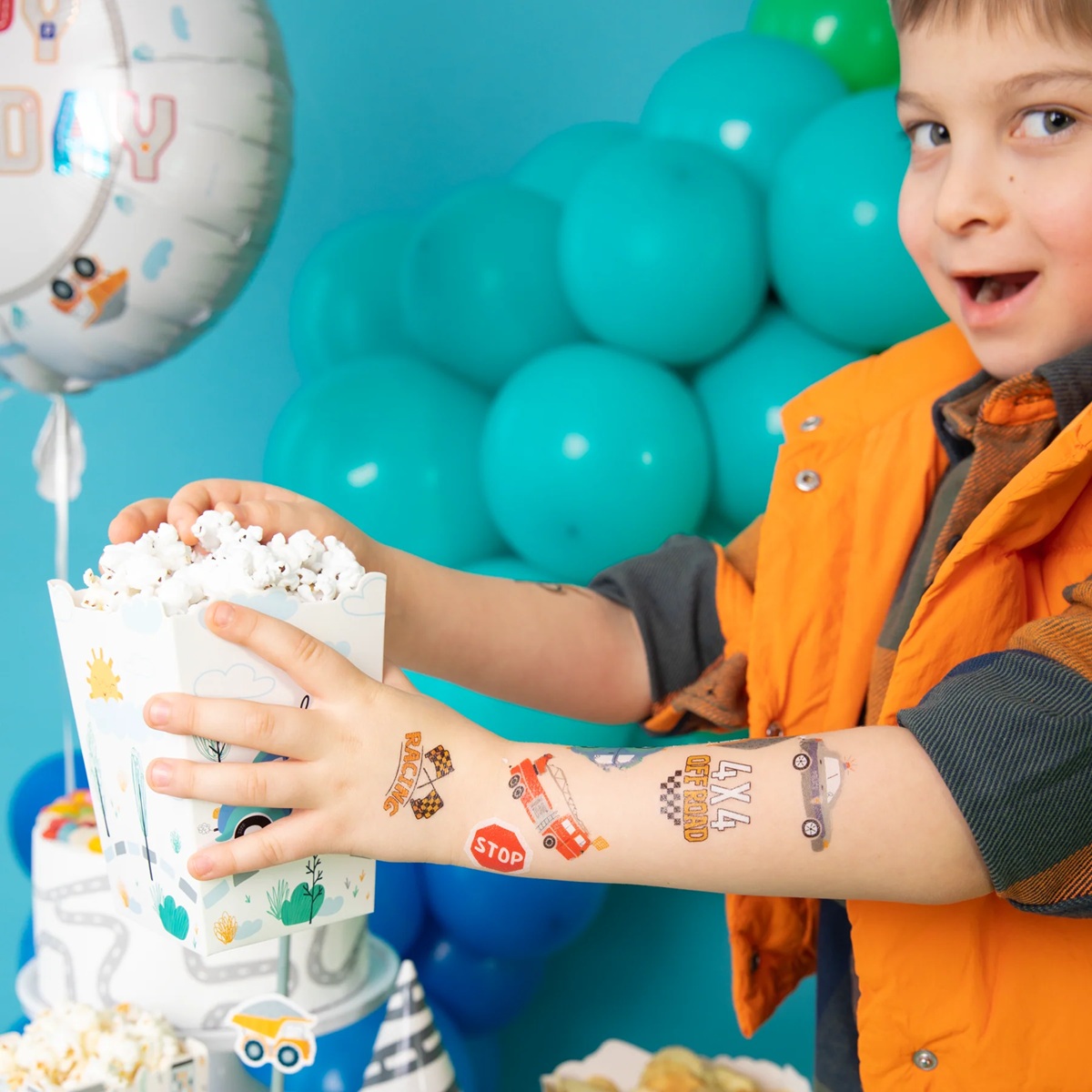Um grande conjunto de tatuagens laváveis ​​que irão satisfazer todos os pequenos fãs de veículos motorizados. Vários tipos de carros, inscrições e símbolos automotivos, cores interessantes e gráficos originais podem tornar a tatuagem o principal ponto de diversão.
