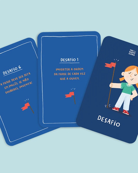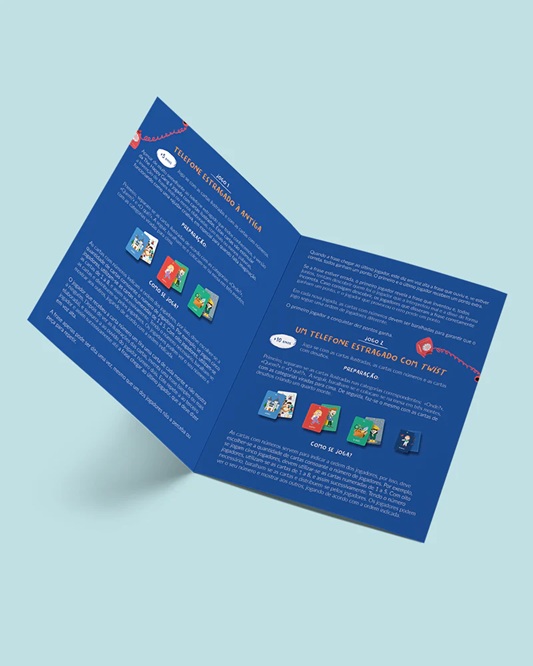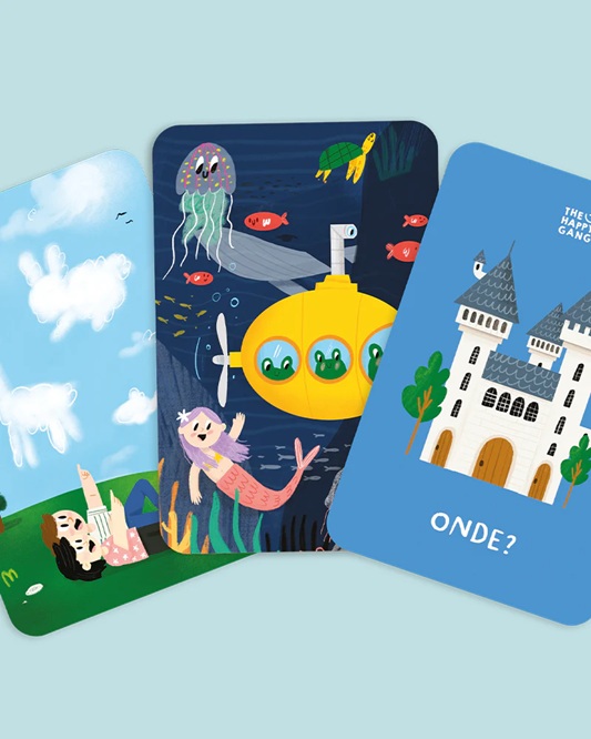 A partir das cartas ilustradas, inventem frases com combinações inesperadas, passem-nas ao ouvido do jogador seguinte e vê como, palavra a palavra, a mensagem muda até chegar ao último da fila!
